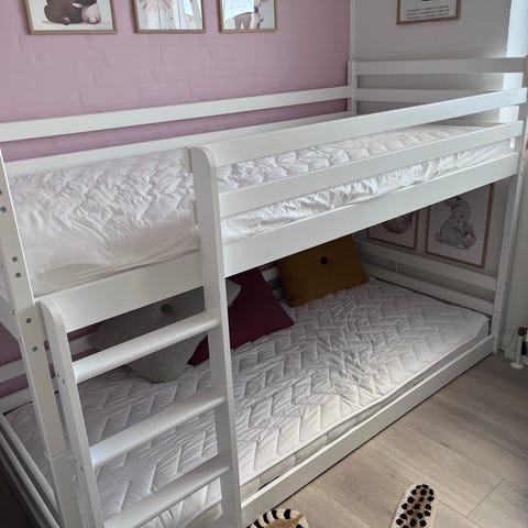 3 personers køjeseng af god kvalitet og meget velholdt. Nederste seng måler 140 x 200 cm og øverste seng er 90 x 200 cm.