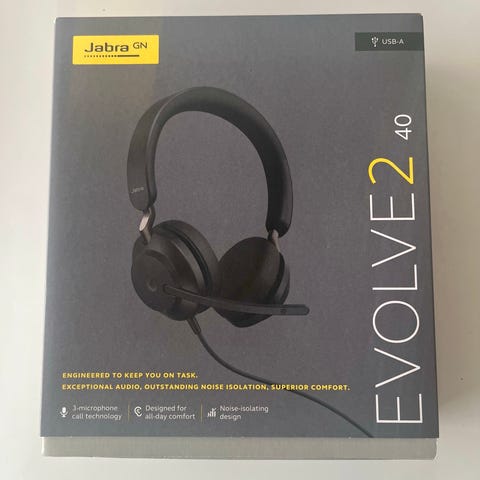 Jabra Evolve2 40 headset i sort. Kablet on-ear headset med justerbar hovedbøjle og polstrede ørepuder. Integreret mikrofon på boom-arm velegnet til tale og onlinemøder. Tilsluttes via kabel (f.eks. USB eller jack, afhængigt af variant). Egnet til brug ved computer eller anden kompatibel enhed i kontor- eller hjemmearbejdsmiljø.