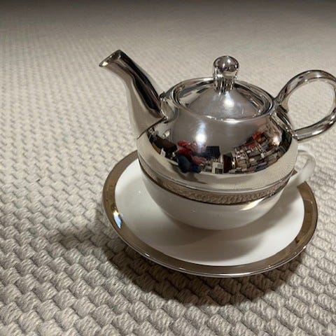 Porcelænsk tekande i hvid med bred blå bort og guldfarvede detaljer. Kanden har låg med guldfarvet knop, buet hank og lang tud. Egnet til servering af te ved borddækning og som del af et stel eller som enkeltstående kande.