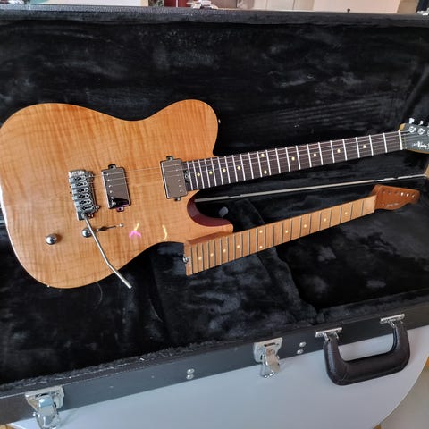 Der medfølger guitartaske, en flot blå guitarrem samt instrumentkabel