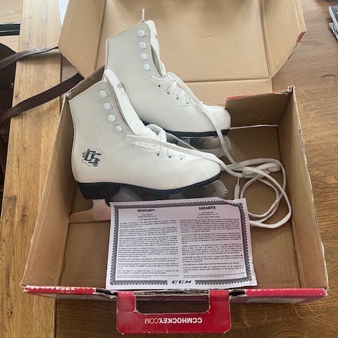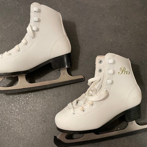 Hvide "Suprime" kunstløberskøjter med intakte snørrebånd. I fin stand, men skal formentlig lige slibes. Str. 37.