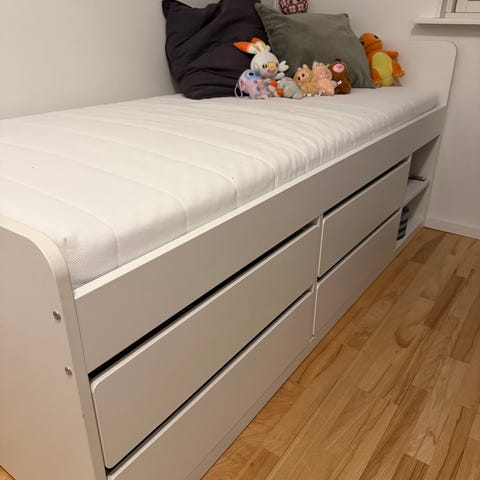IKEA seng i hvid. Sengen har høj gavl med vandrette lameller og plads under sengen til opbevaring. Velegnet som dobbeltseng i soveværelse eller gæsteværelse. Mål og modelnavn kan oplyses efter behov.