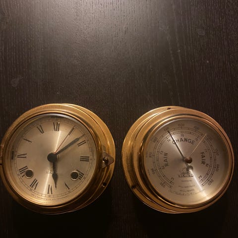 Sælger dette klassiske og eksklusive maritime sæt fra tyske Schatz, model Royal 180. Sættet består af et præcisionsbarometer med termometer og et quartz skibsur monteret på en flot træplade.