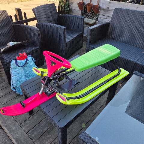 Kælk med rat og bremser til børn. Kælken har styre rat foran og håndbremser i siderne, som giver mulighed for at styre og bremse under kørsel. Foran er der træksnor, så kælken kan trækkes op ad bakken eller bruges til at trække et barn. Som ny.