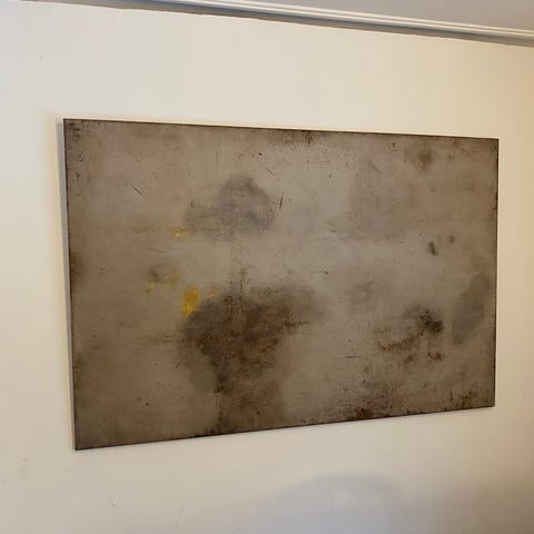 Kunstmaleri med grafisk tekstmotiv i rektangulært format. Det er dansk kunst og i den den særlige form for kunst hvor bogstaver bliver grafik i sig selv.