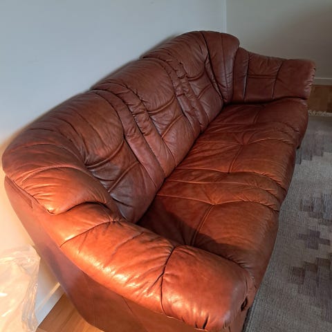 Imiteret lædersofa gives væk. Synlige brugsspor. Læderet skaller. Jeg har givet det en behandling med møbelfarve, hvilket har hjulpet. Men da jeg lejer sommerhuset ud skal det se pænere ud. Sofaen er mere slidt end man kan se på billedet.