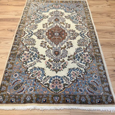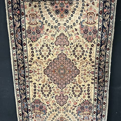 Håndvævet orientalsk tæppe Ghoum, Indien som oprindelsesland, mål 245 × 167 cm, uld på bomuld, ca. 22 kg, fra sent 1900-tallet, generelt i god stand med tegn på alder og brug, med certifikat for ægthed. Klik på den blå "gå til varen" knap, for at købe eller byde på denne vare. Den samlede pris vil blive vist inden du afgiver dit bud.