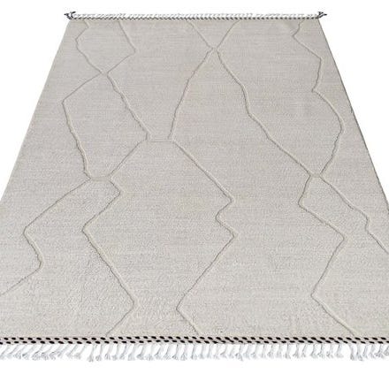 Et elegant håndvævet Berber-tæppe med klassisk diamantmønster på en lys baggrund. Det enkle, men udtryksfulde design i creme og sort bringer ro, naturlighed og stil ind i ethvert rum.