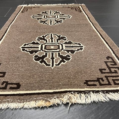 Håndvævet orientalsk tæppe med nepalesisk design, oprindelse Nepal, mål 137 × 73 cm, uld på bomuld, professionelt renset. Klik på den blå "gå til varen" knap, for at købe eller byde på denne vare. Den samlede pris vil blive vist inden du afgiver dit bud.