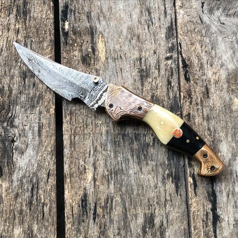 Dette er en bemærkelsesværdigt forgyldt og håndfixeret køkkenkniv, fremstillet af de fineste knivmagere i USA. Dette er en meget flot håndlavet Premium Quality Custom Handmade Collectible Kitchen Utility Pocket Knife, køkkenkniv, multi-lags smedet stål, Leaather Sheaath, køkkenknive. Kniven har et behageligt greb. Bladet er lavet af specielt smedet stål med en høj skæreevne. Denne kniv er både et samlerobjekt og et nyttigt køkkenredskab. De åbne foldbare knive har en længde på ca. 22 cm.