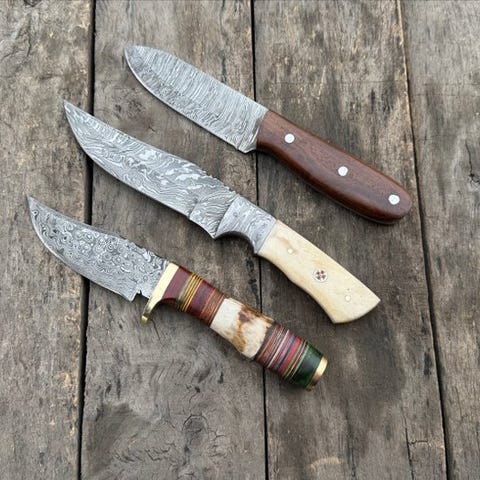 Dette er en bemærkelsesværdigt smedet og håndlavet køkkenkniv fremstillet af de fineste knivmagerne i USA. Dette er en meget velhåndlavet Prestigious Custom Handmade Collectibles Knives, multileg med smedet stål, træ- og knoglehåndtag, læderskede. Kniven har et behageligt greb.Bladet er af særligt smedet stål med høj skærekant. Denne kniv er såvel et samlerobjekt som et brugbart køkkenredskab. De længste knive har en omtrent længde på 26 cm.