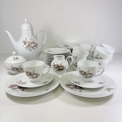Sættets sammensætning: 33 dele, inklusive tallerkener og serveringsgenstande.