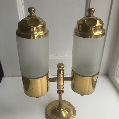Messingen står med den helt rigtige patina og den gule glaskuppel er uden skår og revner.