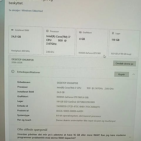 Intel i5-6500 3,2GHz CPU, 8GB RAM, NVidia GTX-960 / 2GB RAM grafik kort, 128GB SSD + 1TB hard disk, DVD drev også bluetooth dongle, nulstillet og klar til færdiggørelse af Windows 10 Home installation. Oprindeligt bygget som gamer PC, men ikke længere kraftig nok til det, men stadig fin som alm. hjemme PC til skrivebordsarbejde.