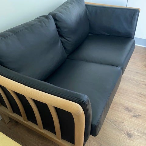 To-personers sofa med sort læderbetræk og lyst træstel. Sofaen har åbne tremmesider og -ryg i lyst træ og polstrede sæder og ryg i glat sort læder eller læderlook. Velegnet til stue, kontor eller mindre opholdsrum, hvor der ønskes en kompakt siddeplads til to personer.