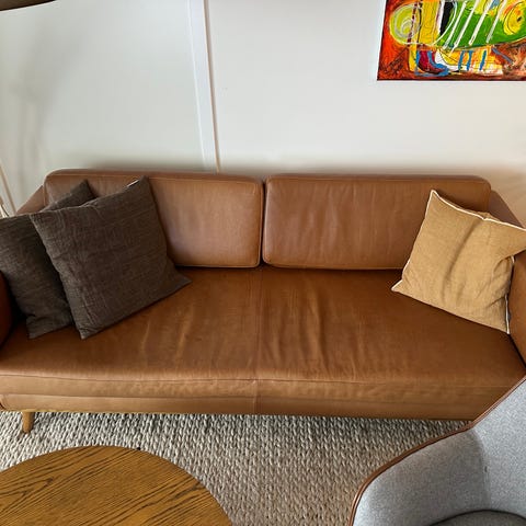 Ny lædersofa fra Sofacompany i modellen “Julia” med chokoladebrunt læder, som er udgået.