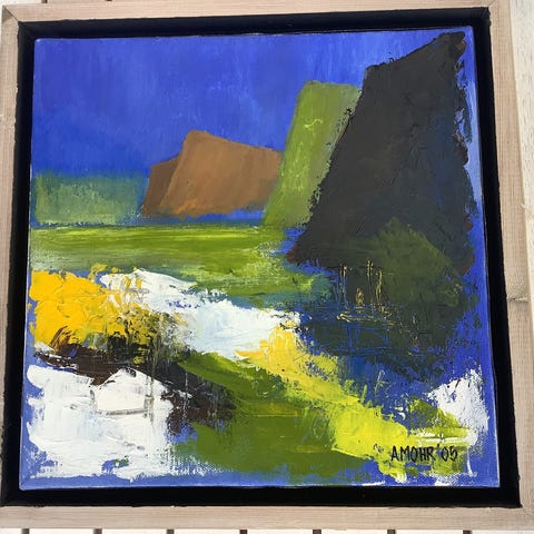 Maleri med farverigt, abstrakt motiv af ansigtslignende figurer. Billedet er kvadratisk og malet i stærke, blandede farver. Velegnet som vægdekoration i stue, gang eller kontor. Kunstner og præcise mål er ikke oplyst. 104x104 incl ramme