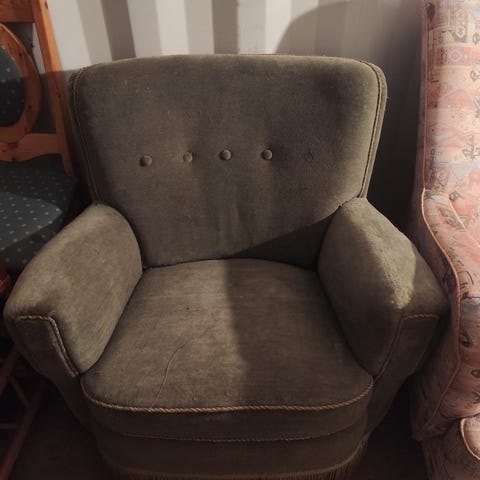 Charmerende og smuk lænestol men meget brugt - skal istandættes hvis den skal stå som ny.