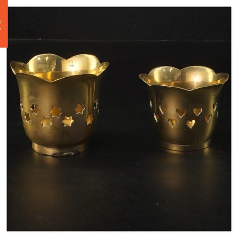 To ældre messing lysestager med afrundet bund og konisk form. Lysestagerne har patina og aldersrelaterede brugsspor, herunder ridser og misfarvninger, som giver dem et vintageudseende.