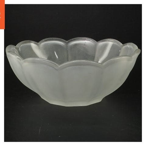 Transparent glasfad med rillet design på siden og en glat overflade indeni.