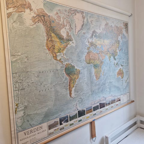 Kortet er pt rullet sammen, så det vil skulle rulles den anden vej eller hænge lidt på væggen for at glattes helt ud.