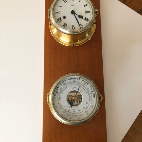 SKIBSUR og BAROMETER i messing. Fra 1970.