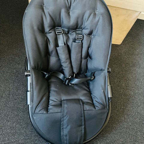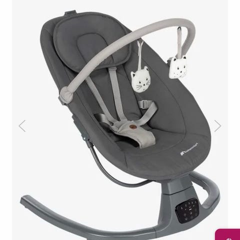 Babystol skråstol med mønstret betræk. Stolen har metalstel og polstret sæde med farverigt print. Udstyret med sele til fastspænding af barnet og justerbar ligge-/siddeposition. Egnet til spædbørn og mindre børn, som har brug for støtte, når de sidder eller ligger.