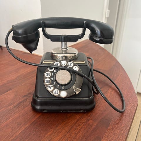 Kirk F51 bakelit drejeskive telefon med stofledning fra 1960erne.
