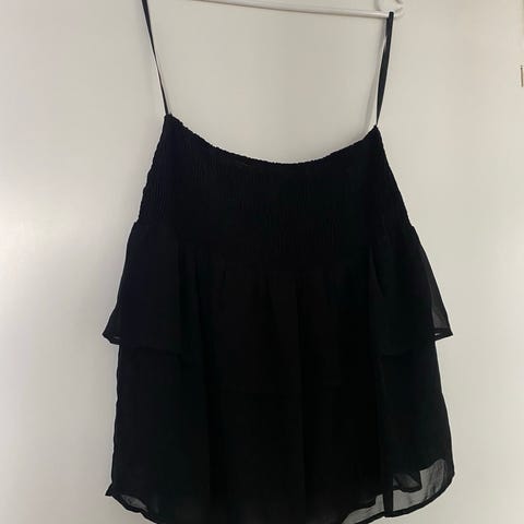 Nederdel med bred flæse, som fortsætter foran op til elastiklinningen - sort foer, som går til knæet. Linningen er 74 cm. (uden at strække) og nederdelens længde er 90 cm. ved sidesømmen.