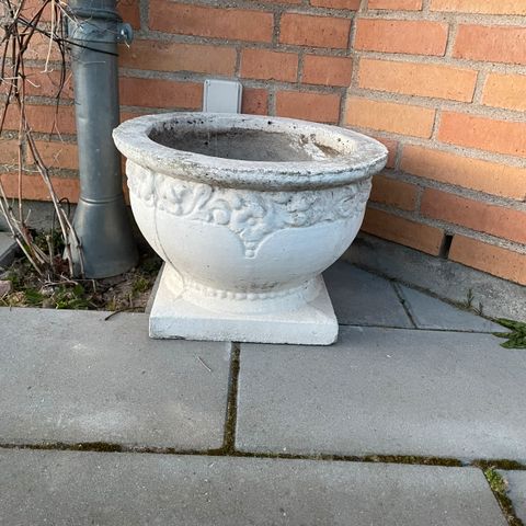 Dekorativ søjlefod i klassisk stil, udført som sokkel med udskårne detaljer og volutter. Overfladen er i en grålig tone med patineret udtryk. Egnet som dekorationssokkel til f.eks. potteplante, skulptur eller lampe i indretningen. Kan placeres på gulv op ad væg eller i et hjørne som markant indretningsdetalje.