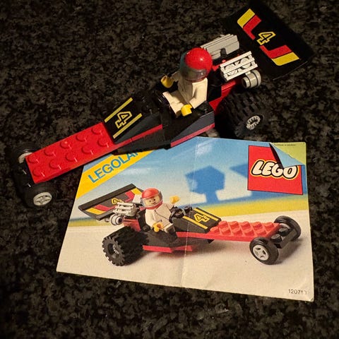 LEGO System racerbil med minifigur. Sættet består af en lille racerbil i flere farver med førersæde og minifigur med hjelm. Der medfølger trykt uoriginal byggevejledning, som viser, hvordan modellen bygges.