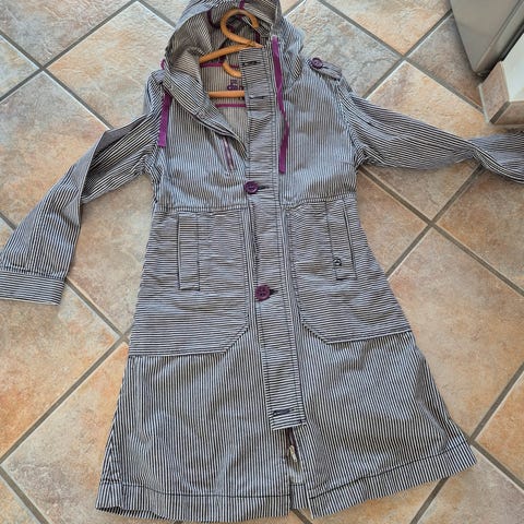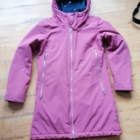 Fin pink Danefæ overgangsfrakke med trykknapper str. M. Frakken er pink udvendig, rød indvendig og den har lommer i siden. Den er rigtig pæn, den er dog gået op et par steder i kantbåndet i halsen, men det kan let syes. Materiale; 100% polyester