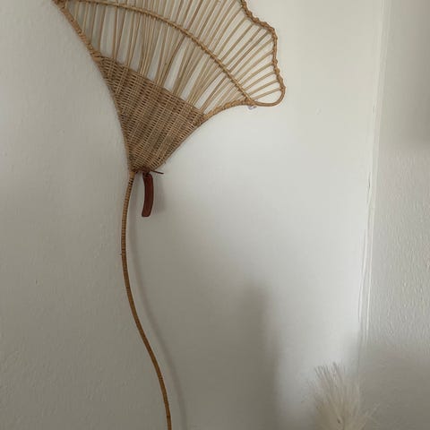 Riviera Maison vægdekoration i flettet naturmateriale. Dekorationen er formet som et blad/bladvifte og monteres på væggen. Farven er natur. Velegnet som vægpynt i stue, soveværelse eller entré. Mål fremgår delvist af billedet med målebånd, hvor selve bladformen måles i højden.