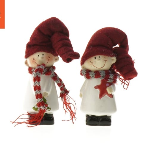 Dette er et sæt af to små dekorative figurer fremstillet i en hvid farve, hver omkring 10 cm høje. Den ene figur holder en lille rød gave i hånden, mens den anden holder en lysestage med et stearinlys. Begge figurer er klædt i detaljerede kåber med en glitrende finish. De er velegnede til dekorative formål, specielt i højtider såsom jul.