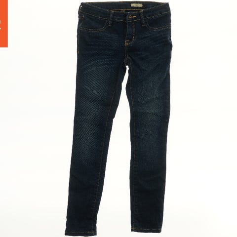 Par børnejeans i mørkeblå farve. De har to forlommer og to baglommer. Der er en knap- og lynlåslukning foran. Bukserne har bæltestropper.