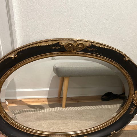 Vægspejl, b: 24 h: 31, Ovalt gammelt spejl med guldramme skal sælges billigt og hurtigt Giv et bud. Guldfarvet spejl rundt spejl ovalt spejl lille spejl