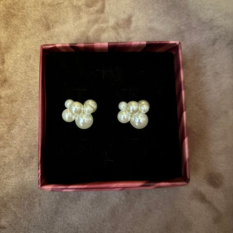 Et par vintage perleøreringe med klynge af kunstige perler i en drueklase design. Øreringene har mørke metaldetaljer og er i størrelse 5 cm længde. Disse er favoritaccessories til særlige lejligheder eller til at tilføje et klassisk touch til ethvert outfit.
