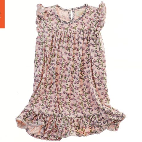 En kortærmet kjole med et blomstret mønster. Kjolen har et overordnet hvidt farvetema med blå og gule blomster trykt over hele kjolen. Den har en rund halsudskæring og en let frill nederst. Der er en åbning bagpå med en knaplukning.