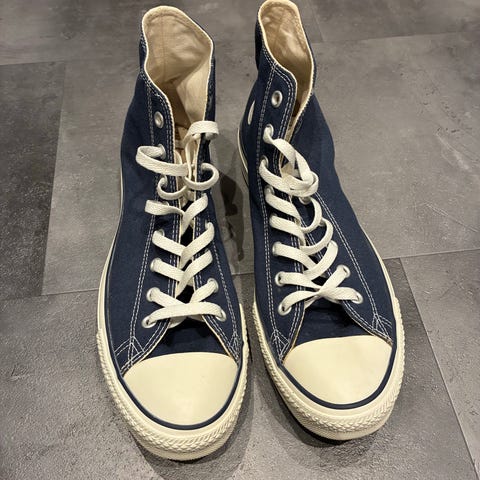 Dette er et par grå Converse All Star sneakers med høj top. Skoene har hvide snørebånd og en hvid gummisål med sorte striber. De er lavet af tekstilmateriale og har Converse All Star-logoet på bagsiden. Skoenes længde er 33 cm.