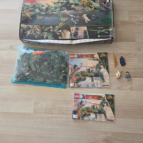 LEGO Ninjago drage byggesæt med gylden og grøn dragefigur, fjendtlige figurer og mindre sidebygninger. Sættet indeholder flere minifigurer med våben og tilbehør samt en detaljeret drage med bevægelige ben, vinger og hale. Egnet til leg og samling for fans af LEGO Ninjago universet.