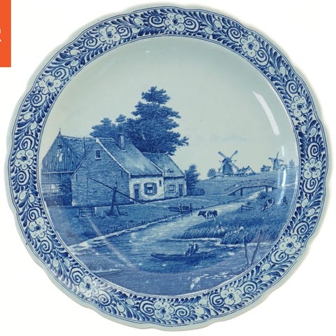Denne dekorative porcelænstallerken, der har en diameter på 27 cm, er prydet med et blåt mønster bestående af blomster og en figurcentreret design. Pladen er ideel til ophæng eller som borddekoration for en elegant præsentation. Bagsiden af tallerkenen har en håndskrevet tekst, der antyder at den er håndlavet i Rhodos Grækenland.