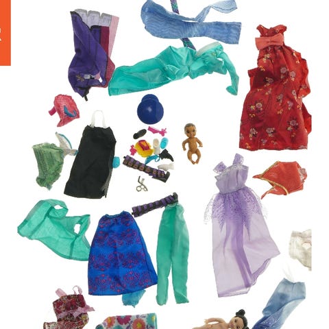 Objectet er tre små dukker, hver cirka 15 cm høje. To af dukkerne har blond hår og er klædt i klassiske kjoler med forklæder, den ene i en blomstret kjole og den anden en ternet kjole. Den tredje dukke har også blond hår og er iklædt en rød kjole. Dukkerne lader til at være lavet af plastik og stof.