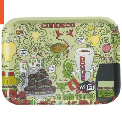 Denne serveringsbakke er en rektangulær flad plastikbakke med et unikt motiv, der forestiller forskellige køkkenelementer som grøntsager, frugter og karafler. Bakken virker praktisk til servering af mad og drikkevarer og kan være et farverigt indslag i køkkenet.