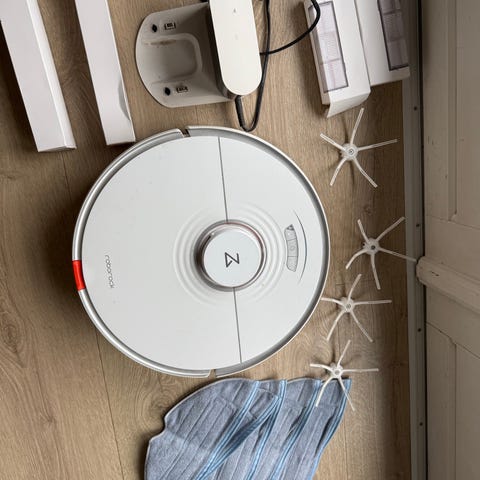 Roborock S8 robotstøvsuger i hvid. Enheden er rund og egnet til automatisk støvsugning af hårde gulve og tæpper. Støvbeholderen er placeret under det øverste låg, hvor der også er adgang til filter. Medfølgende tilbehør omfatter blandt andet ekstra filtre, børster og moppeklud, som ses på billederne. Robotstøvsugeren er egnet til daglig rengøring i hjemmet og kan navigere rundt om møbler og forhindringer ved hjælp af indstillinger og sensorer i modellen.