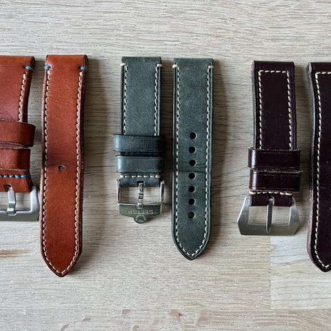 Næsten ny uoriginal Panerai urrem i brunt russisk læder til mand. Kun brugt en gang. Remmen er udført i glat læder med kontrastsyninger og klassisk spænde i metal. Velegnet som erstatningsrem til Panerai herreure med tilsvarende rembredde.