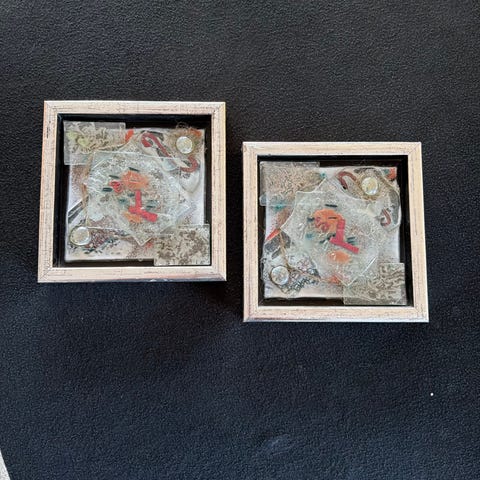 Sæt med to dekorative vægbilleder med stiliseret figurmotiv. Begge billeder er kvadratiske gips med påmonterede figurer i relief. Det ene motiv har røde hjerter og røde striber nederst, det andet har grønt og blåt bølgemønster med turkise striber nederst. Velegnet som vægdekoration i f.eks. stue, børneværelse eller entré.