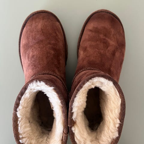 UGG sko i størrelse 37. Skoene er i brun ruskind med kraftig sål og broderet kant i rød og lys kontrastfarve omkring åbningen. De er købt december 2025, brugt lidt men ellers i god stand