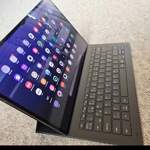 Samsung Galaxy Tab S tablet med aftageligt tastatur og stylus-pen. Enheden har stor skærm egnet til både arbejde, studier og underholdning. Tastaturet fungerer som cover og støtte, så tabletten kan stå oprejst på bordet. Stylus-pennen kan opbevares magnetisk på bagsiden. Velegnet til brug af apps, internet, tekstbehandling og tegning/noter. Farven fremstår mørk (fx grå eller sort). Nøjagtig lagerkapacitet og skærmstørrelse er ikke oplyst.