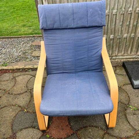 Lænestol med høj ryg som kan lægges ned til ca 45 grader og indbygget fodstøtte der kan klappes ud. Kan afhentes gratis i Roskilde.