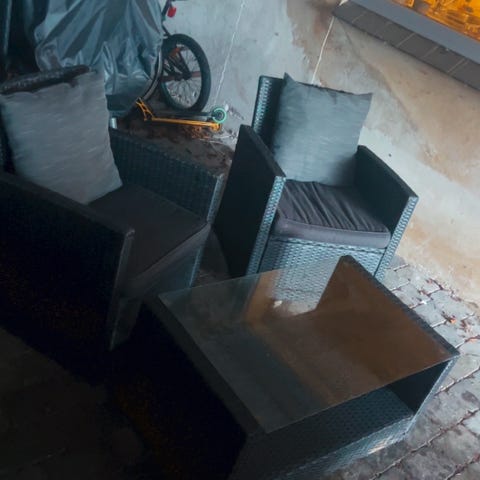 Havemøbelsæt bestående af to loungestole i flet, to matchende fodskamler samt et lille bord.